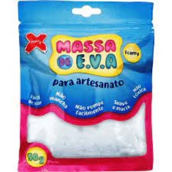 Massa flocada de eva para uso em artesanatos. Com flocos de isopor, secagem em aproximadamente 6 horas em contato com ar, não tóxico, tingível, suave e macia e não mancha. Produto muito leve após seco, super maleável, rendimento equivalente a 50g de biscuit.