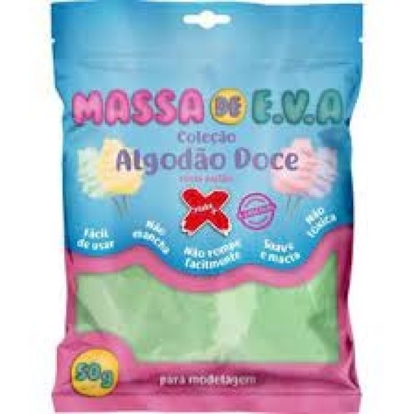 Massa flocada de eva para uso em artesanatos. Com flocos de isopor, secagem em aproximadamente 6 horas em contato com ar, não tóxico, tingível, suave e macia e não mancha. Produto muito leve após seco, super maleável, rendimento equivalente a 50g de biscuit.